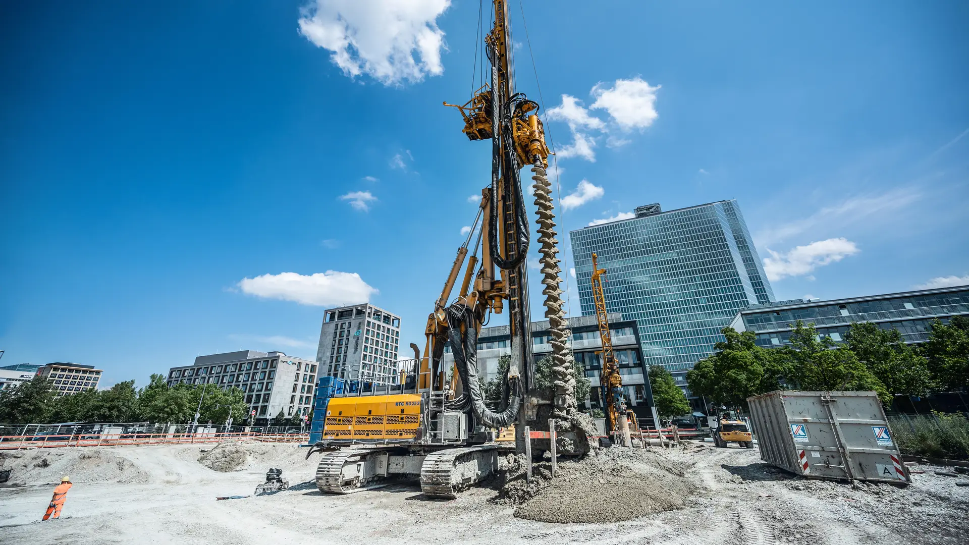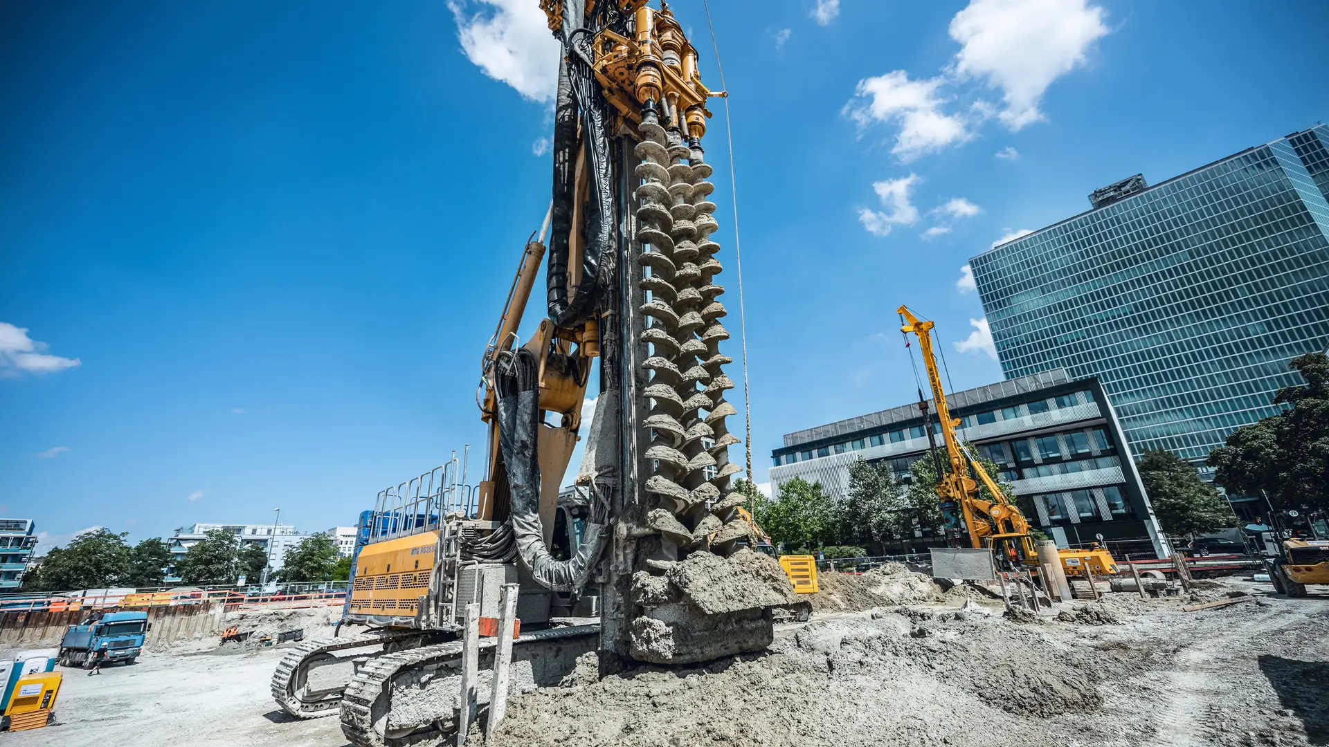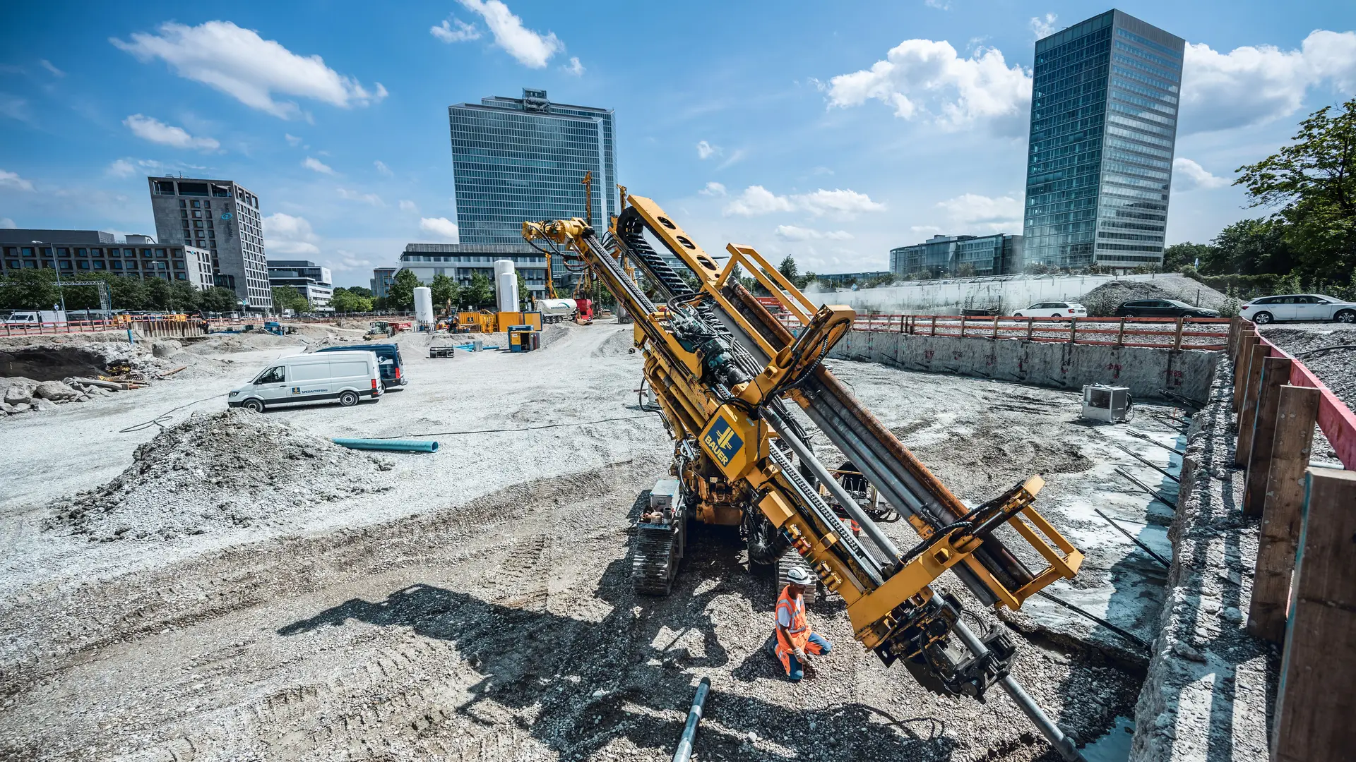 In der Parkstadt Schwabing im Münchener Norden stellte unser Team von Bauer Spezialtiefbau eine Baugrube her – und das auf einem 13.000 m2 großen Areal für ein neues Bürogebäude. Für die 9 m tiefe Baugrube erstellte Bauer eine 6.000 m² einfach rückverankerte Mixed-in-Place-Dichtwand (MIP) mit einer Mächtigkeit von 550 mm und eingestellten Doppel-U-Trägern bis in 17 m Tiefe. Große Dimensionen, doch für unsere Experten kein Problem. Und das ist längst nicht alles: Zusätzlich wurden 750 m² Spundwand mit einer maximalen Tiefe von 16 m und 3.000 lfm Anker zur Wasserhaltung eingebaut. Der Einsatz von Tiefendrainagen erforderte einen hohen logistischen Aufwand und eine genaue Abstimmung mit dem Erdbau. Es war also äußerste Vorsicht und gute Planung geboten.