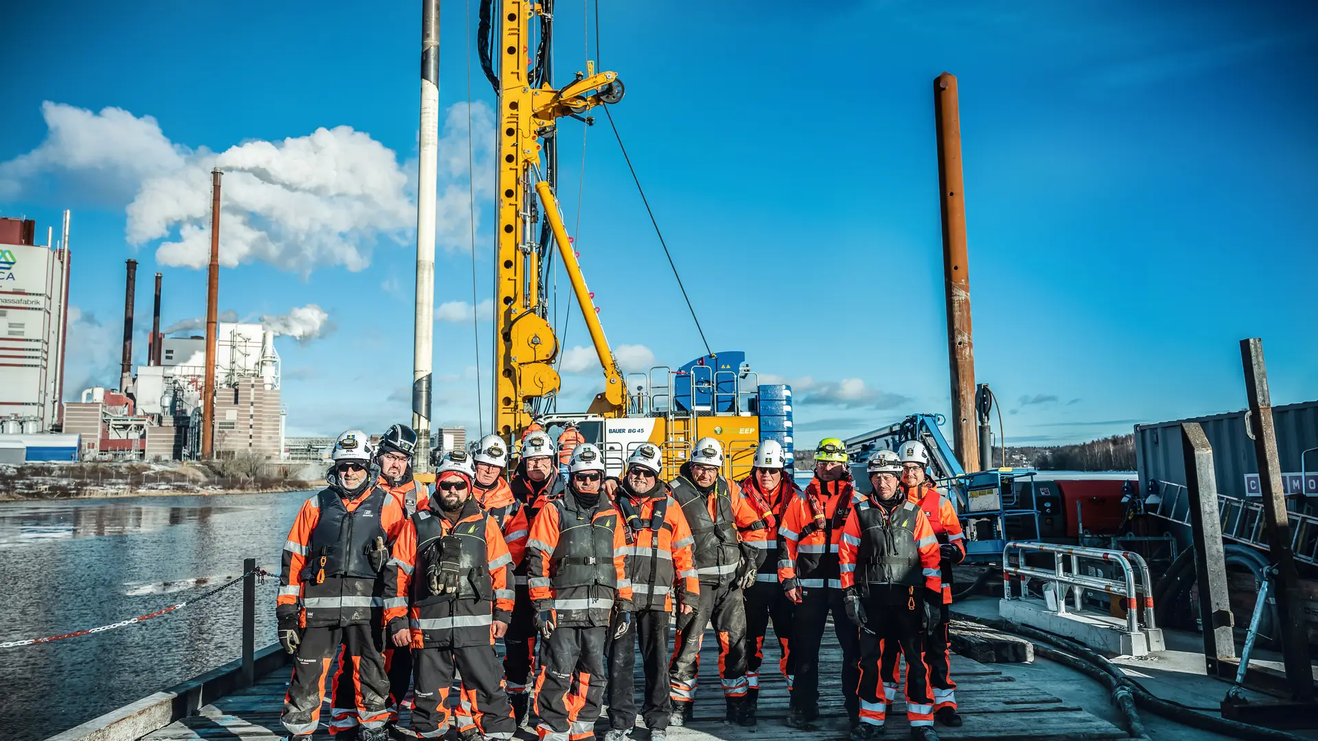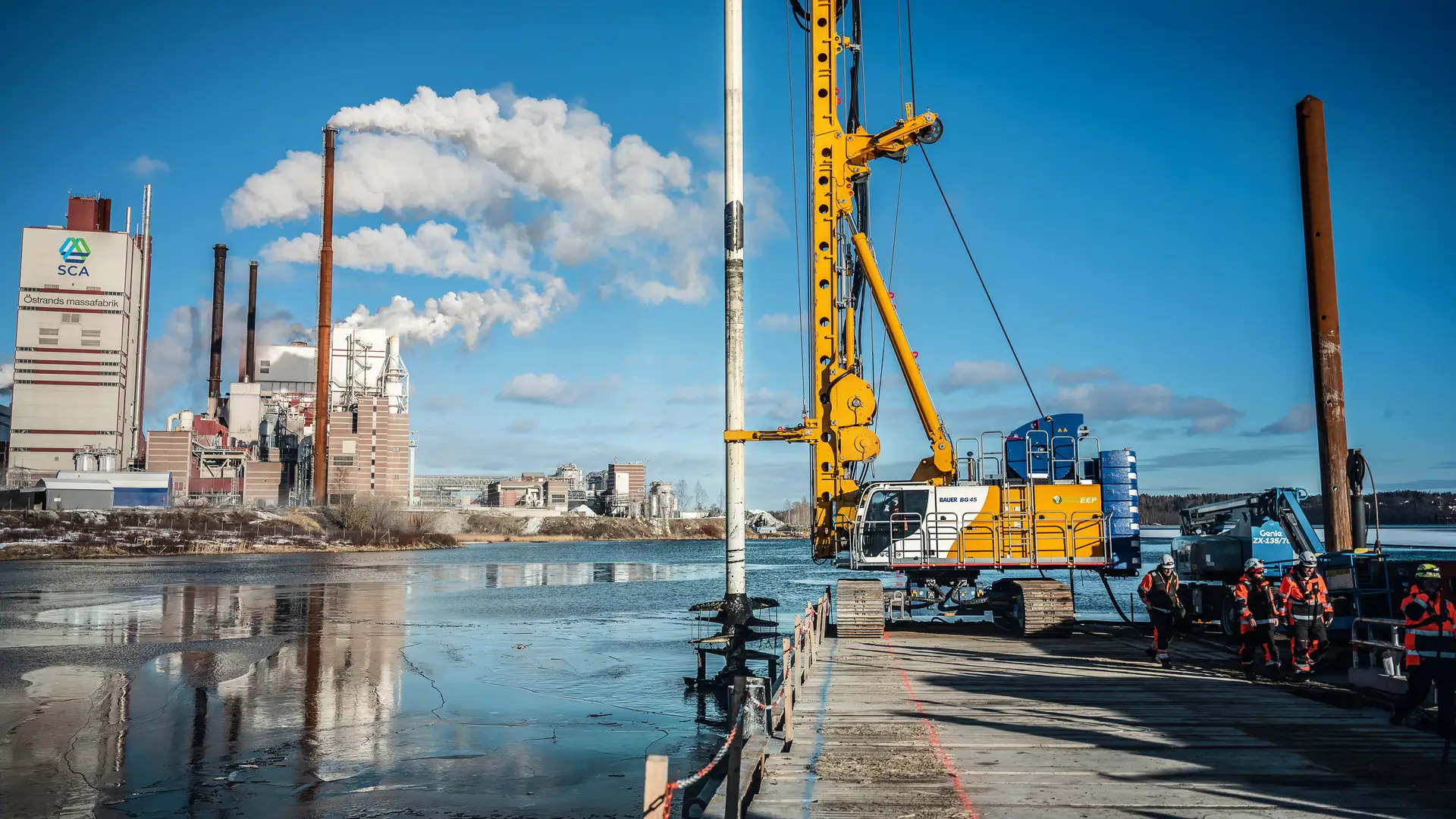 In Timrå, etwa 400 km nördlich von Stockholm, befindet sich das Zellstoffwerk Östrand des schwedischen Forstindustrieunternehmens SCA. Für die Erschließung eines neuen Industriegebiets westlich des Werks haben unsere Experten von Bauer Spezialtiefbau unter Beweis gestellt, dass sie auch unter Wasser beeindruckende Arbeit leisten können. Mit dem Single-Column-Mixing-Verfahren (SCM) haben sie insgesamt 210.000 m³ Mischsäulen mit einer beachtlichen Länge von bis zu 26,9 m errichtet, um den Boden für einen zukünftigen Damm in Küstennähe zu verbessern. Gesagt, getan – doch wie bringt man derartig große Säulen in den Meeresboden ein? Die Lösung unserer Kollegen: der Einsatz von einem riesigen SCM-Mischwerkzeug mit einem Durchmesser von 3 m.