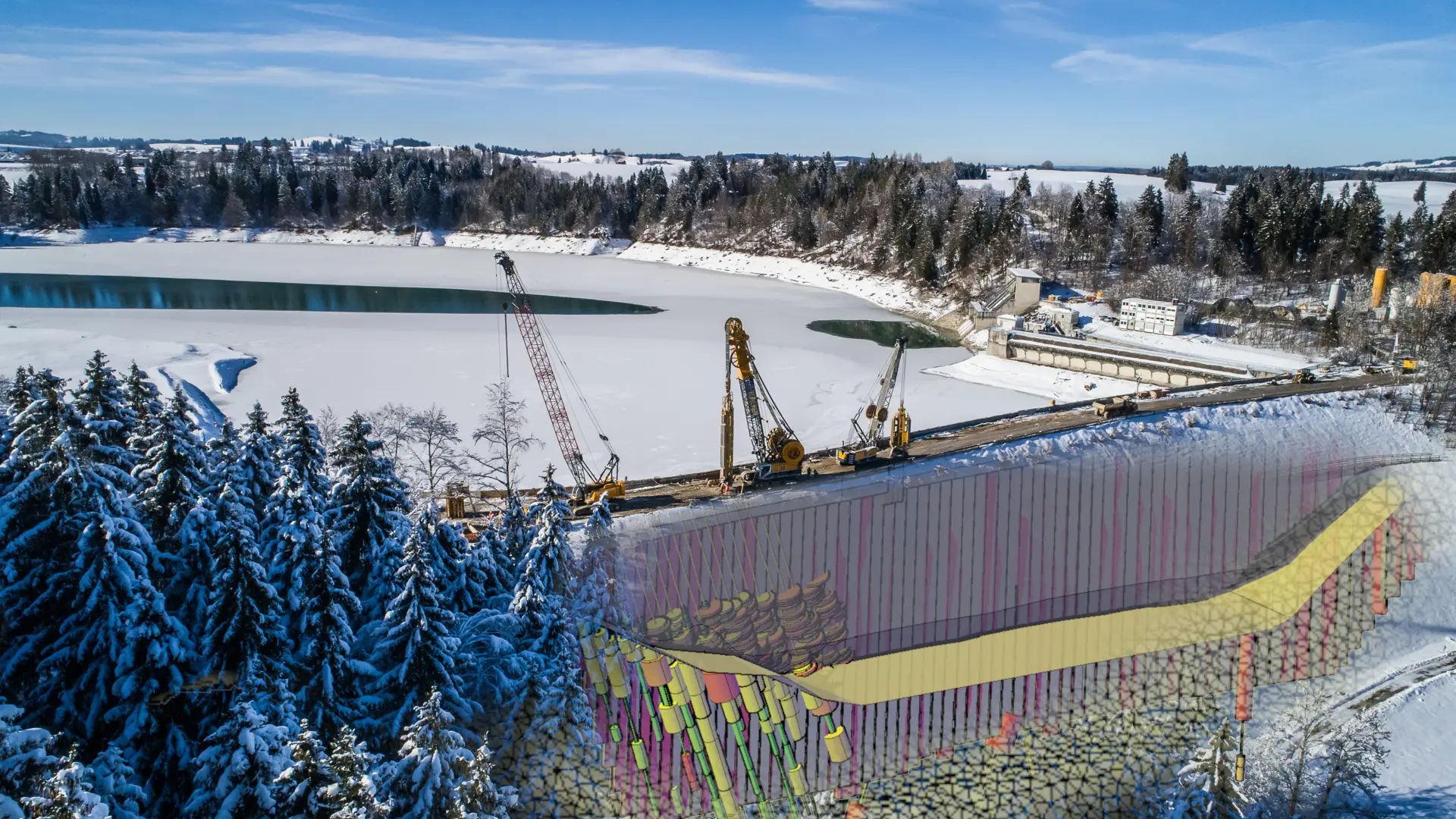 Die Talsperre Rosshaupten am Forggensee in Bayern, nahe dem berühmten Schloss Neuschwanstein, wird durch einen 40 m hohen Erdwall gebildet. Unsere Experten von Bauer Spezialtiefbau führten hierfür den Bau einer Dichtwand aus Tonbeton durch, inklusive Bohr- und Injektionsmaßnahmen – und das bis in 85 m Tiefe. Einzigartig war die Installation unserer Mixed-in-Place-Dichtwand zur Stabilisierung. Hindernisse bis 48 m Tiefe wurden entfernt und die Hohlräume mit Magerbeton verfüllt. Die Dichtwand wurde ohne Aufweitung der Dammkrone hergestellt, unterstützt von speziellen Winterausrüstungen für Arbeiten bei bis zu -20°C. Die Wetterbedingungen stellten nämlich eine besondere Herausforderung dar. Großes Projekt, viele Herausforderungen und ein erfolgreicher Abschluss für unser Team.