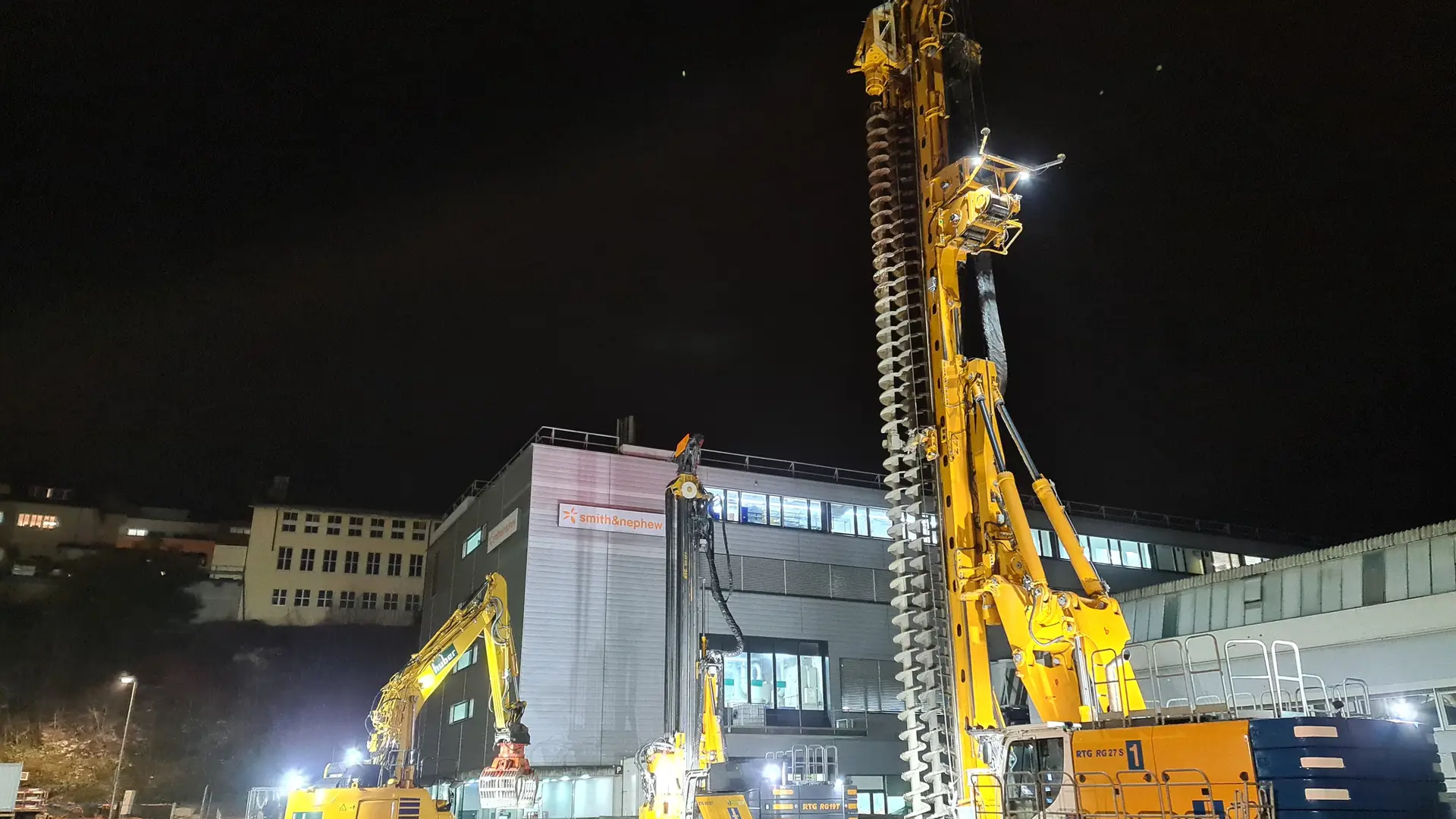 Für die Erweiterung der Hirslanden Klinik Aarau ersetzten unsere Experten der Bauer Spezialtiefbau Schweiz die geplante Spundwand durch eine Mixed-in-Place-Wand (MIP). Die 550 mm starke Wand reicht bis zu 17 m tief und enthält HEB- sowie Doppel-UPE-Träger. Zwei Bereiche wurden mit 2 m breiten Jetting-Säulen gesichert. Aufgrund von Umweltauflagen wird ein Teil der MIP-Wand 2025 im Kellybohrverfahren wieder entfernt. Die Arbeiten starteten im Januar 2024 und wurden termingerecht im Februar abgeschlossen. Zum Einsatz kamen die RTG RG 27 S und RG 19 T für Trägereinbau und Spritzschutz.