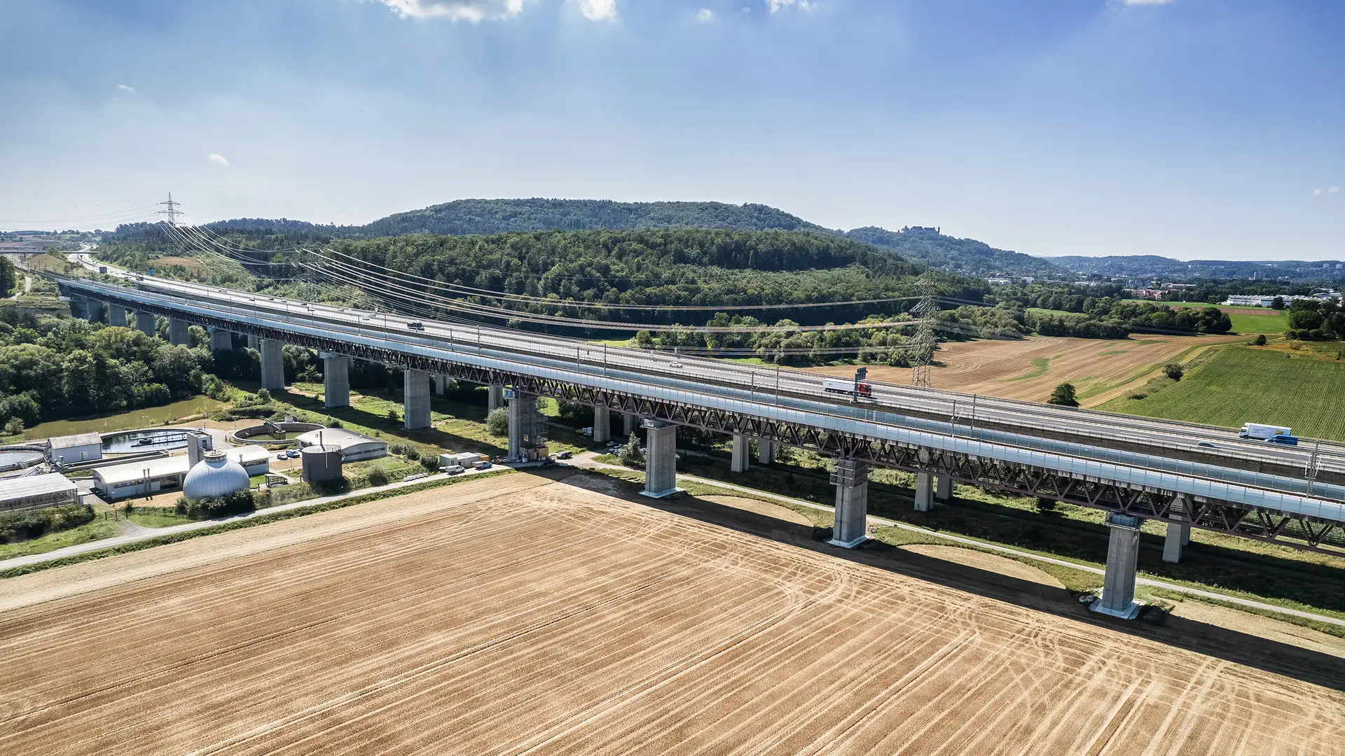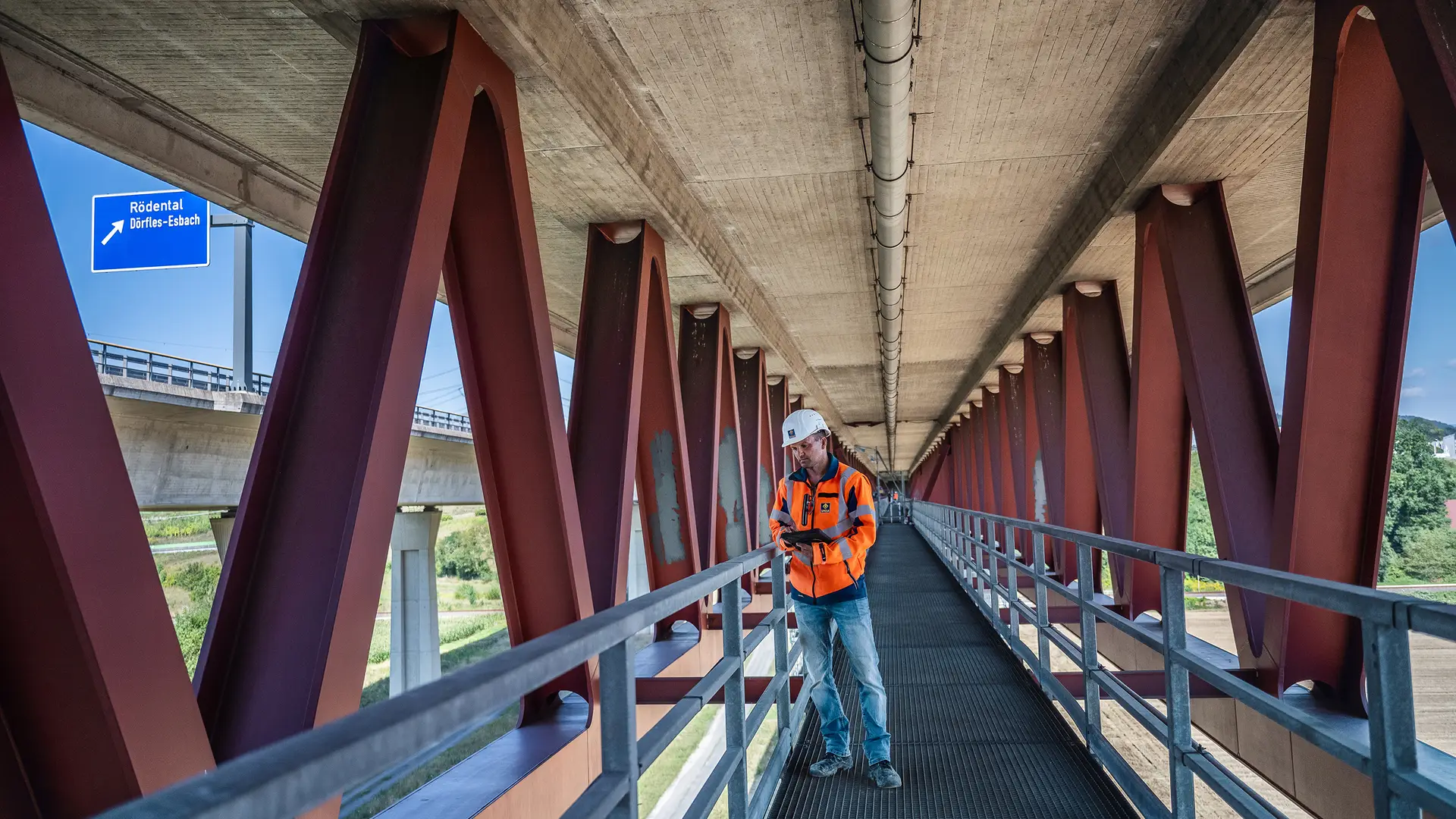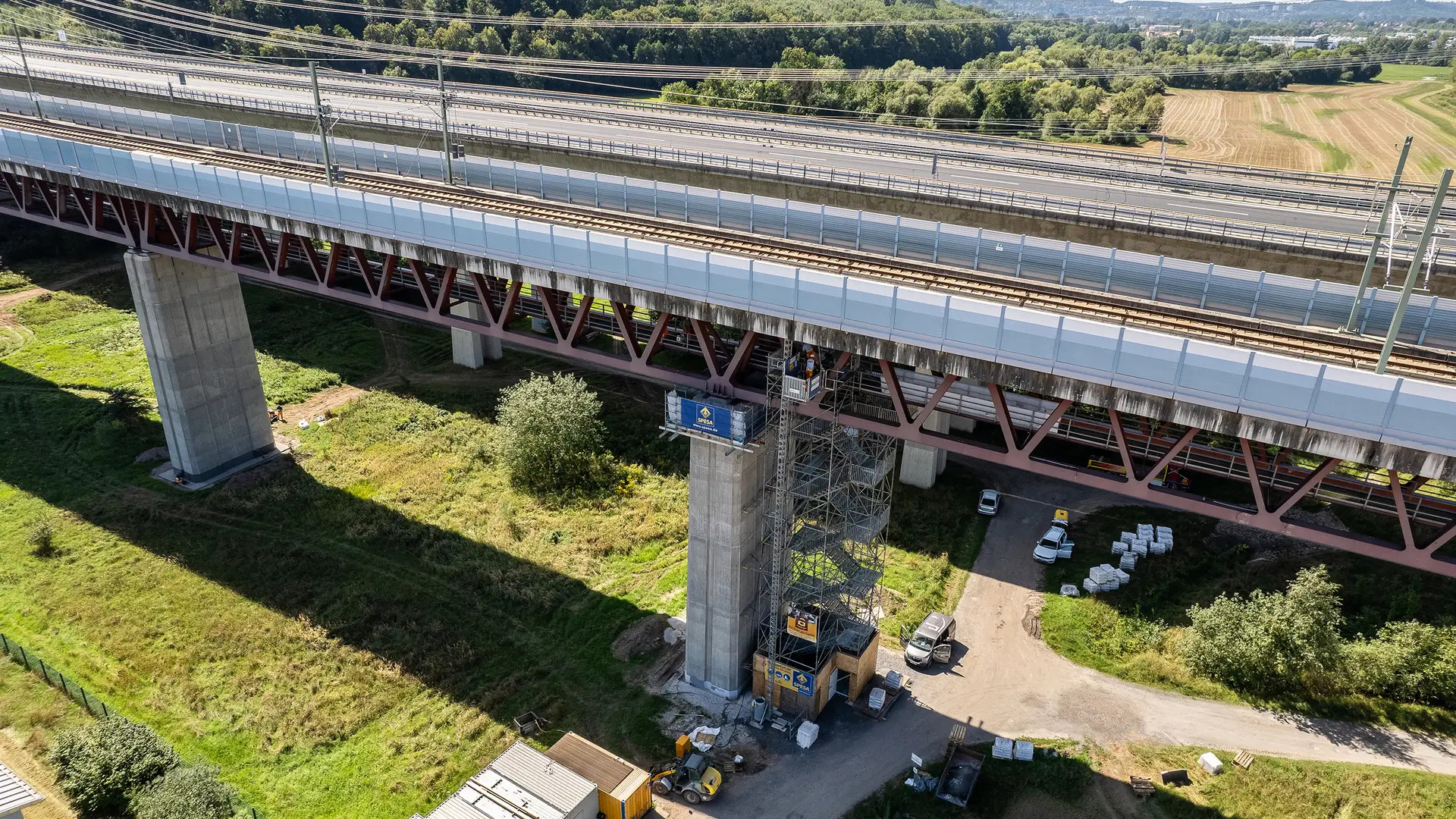 Rödental – Sie ist über 20 Jahre alt, hat insgesamt 14 Pfeilerköpfe und -füße und besteht aus einer 868 m langen Stahlverbundkonstruktion: die Eisenbahnüberführung Itztalbrücke. Die rund 30 m hohe Eisenbahnbrücke ist Teil der Schnellfahrstrecke durch den Thüringer Wald und verläuft zwischen den oberfränkischen Orten Rödental und Dörfles-Esbach. Das Problem: Risse an den Pfeilerköpfen durch eine beginnende Treibreaktion im Beton, die durch Feuchtigkeit zu Ausblühungen und Rissen am Betontragwerk der Pfeiler führt. Um die Standsicherheit der Itztalbrücke dauerhaft zu sichern und den Wasserzutritt zu unterbinden, wurde die SPESA Spezialbau und Sanierung GmbH gemeinsam mit den Stahlbau-Experten der SCHACHTBAU NORDHAUSEN GmbH mit umfangreichen Betonsanierungs- und Stahlbauertüchtigungsmaßnahmen betraut. Nach rund einem Jahr Bauzeit konnte der Auftrag als Nachunternehmerleistung der DB Bahnbau Gruppe GmbH als Hauptauftragnehmer der DB InfraGO AG im Juni 2024 erfolgreich abgeschlossen werden.