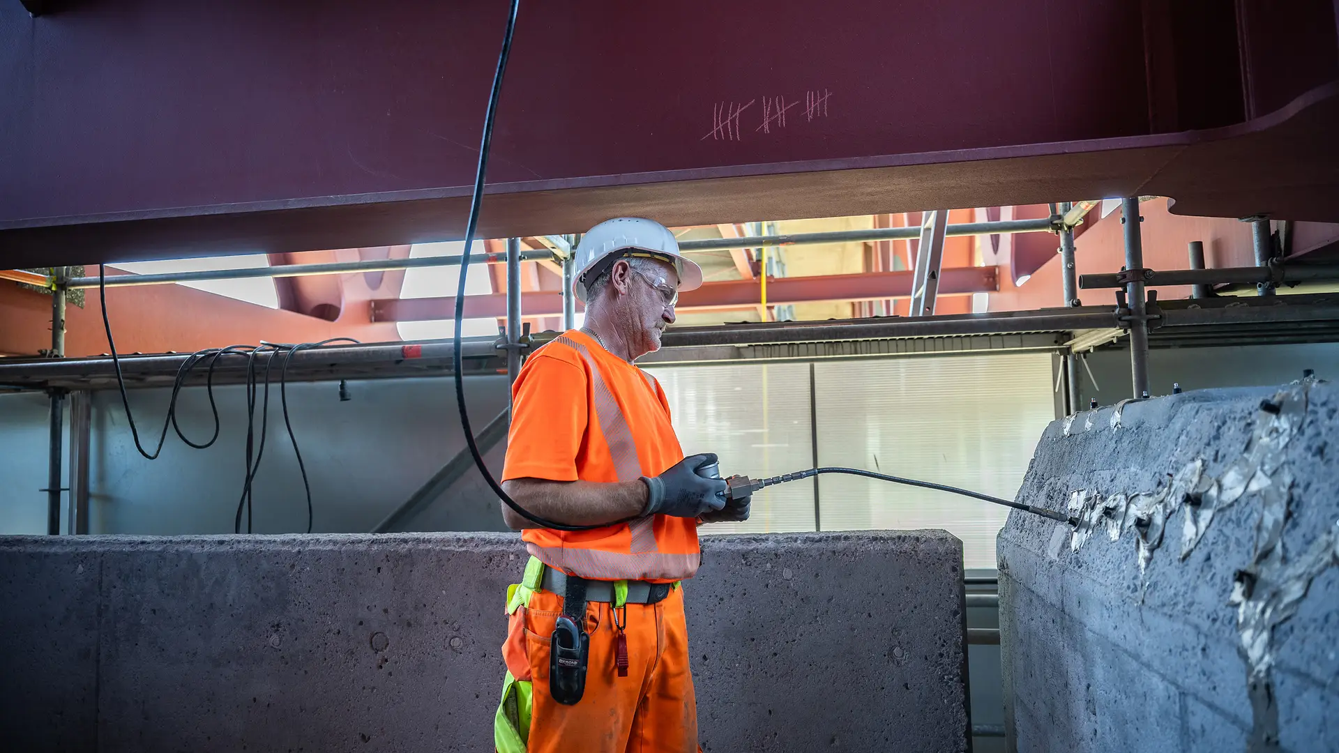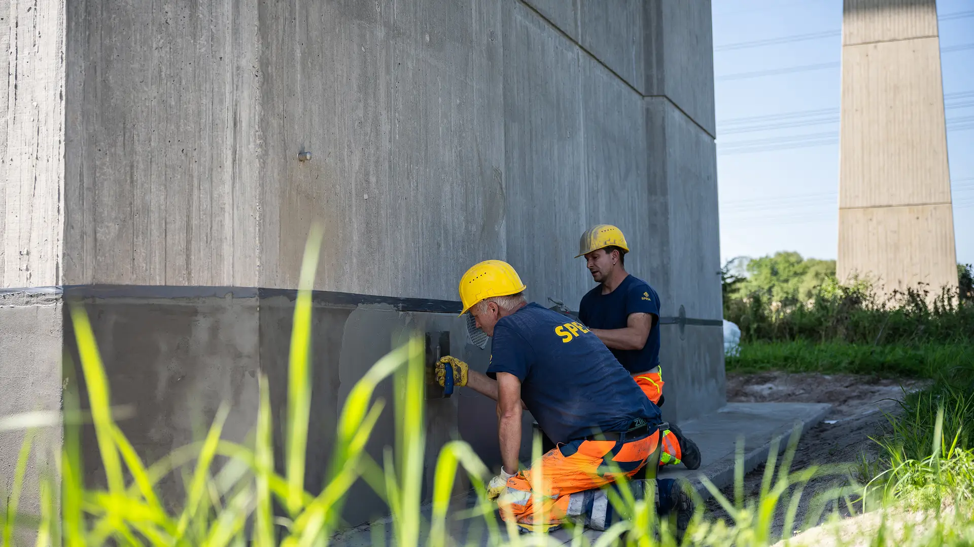Bei den Arbeiten standen zu Beginn die Pfeilerköpfe im Fokus. Zunächst wurde der Untergrund auf einer Fläche von 3.500 m² umfangreich vorbereitet. Es folgte das Verdämmen und Verpressen von rund 2.000 m an vorhandenen Rissen. Den Abschluss bildete die Beschichtung der gesamten bearbeiteten Fläche von 3.500 m². Darüber hinaus verbauten die Spezialisten auf den Inspektionsplattformen 500 m² Gefälle-PCC mit rückverankerten Edelstahlmatten, die anschließend mit einem rissüberbrückenden, begehbaren Oberflächenschutzsystem versiegelt wurden. Zusätzlich wurden 1.800 m Nuten für die Sensortechnik hergestellt und umfangreiche Maßnahmen ergriffen, um auch die Pfeilerfüße vor eindringender Feuchtigkeit zu schützen.