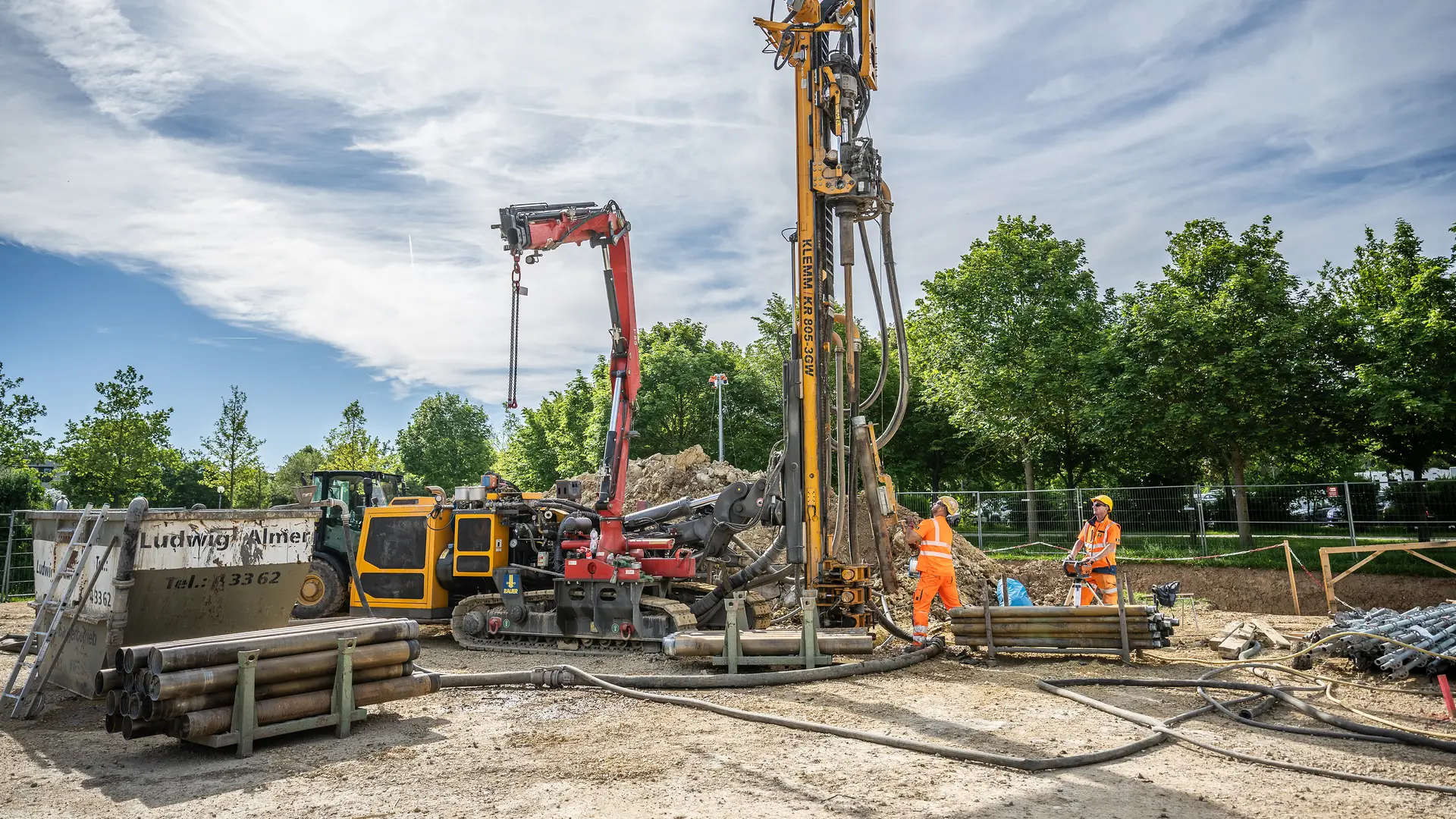 Vor Ort haben die Geothermie-Spezialisten das volle Programm geboten: Von der Vorerkundung inklusive Probebohrungen über die detaillierte Planung bis hin zur vollständigen Umsetzung der Erdwärmesondenanlage – alles aus einer Hand. Und dabei hatten sie auch noch die passenden Geräte und das Ausbaumaterial aus dem Hause Bauer im Gepäck. Seit September 2023 war das Team um Bauleiter Tobias Sailer von der BAUER Resources GmbH unermüdlich im Einsatz. Schritt für Schritt bohrten sie sich mit einer KLEMM KR 805-3GW durch das Baufeld und installierten 24 Erdwärmesonden. „Danach ging es an die Verlegung der Rohre, die im Vergleich zu anderen Projekten überschaubar war – es handelte sich um lediglich 1,3 km“, sagt Tobias Sailer und ergänzt: „Die Geothermieanlage ist klein, aber fein.“ Trotz ihrer kompakten Größe produziert sie am Ende bis zu 85 MWh Wärmeenergie pro Jahr, was in etwa dem Energiebedarf von 17 modernen Wohnhäusern entspricht.