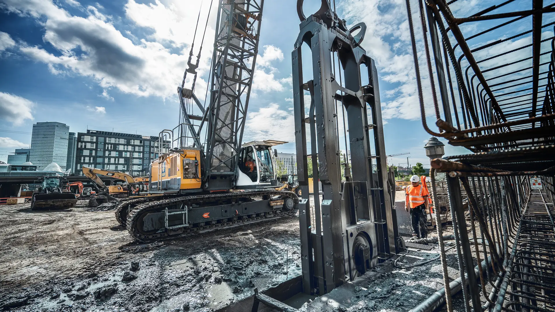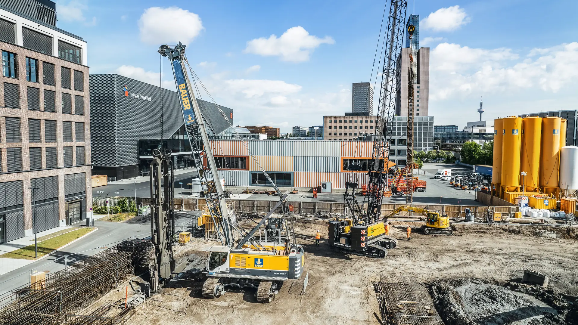 Our experts from Bauer Spezialtiefbau were commissioned to construct an excavation pit in the metropolis on the Main River in the immediate vicinity of the Messe Frankfurt exhibition grounds for a new hotel and office high-rise as well as for the South entrance of the exhibition grounds. What this actually means: A total of 45 fully cased foundation piles with a diameter of 1,500 mm were constructed along with a 240 m two-phase diaphragm wall, up to a depth of 33 m. This formed the basis for the construction of a 123 m tall skyscraper with a four-story underground garage. The logistics were particularly challenging due to the lack of available storage area. The solution? Good planning and organization.