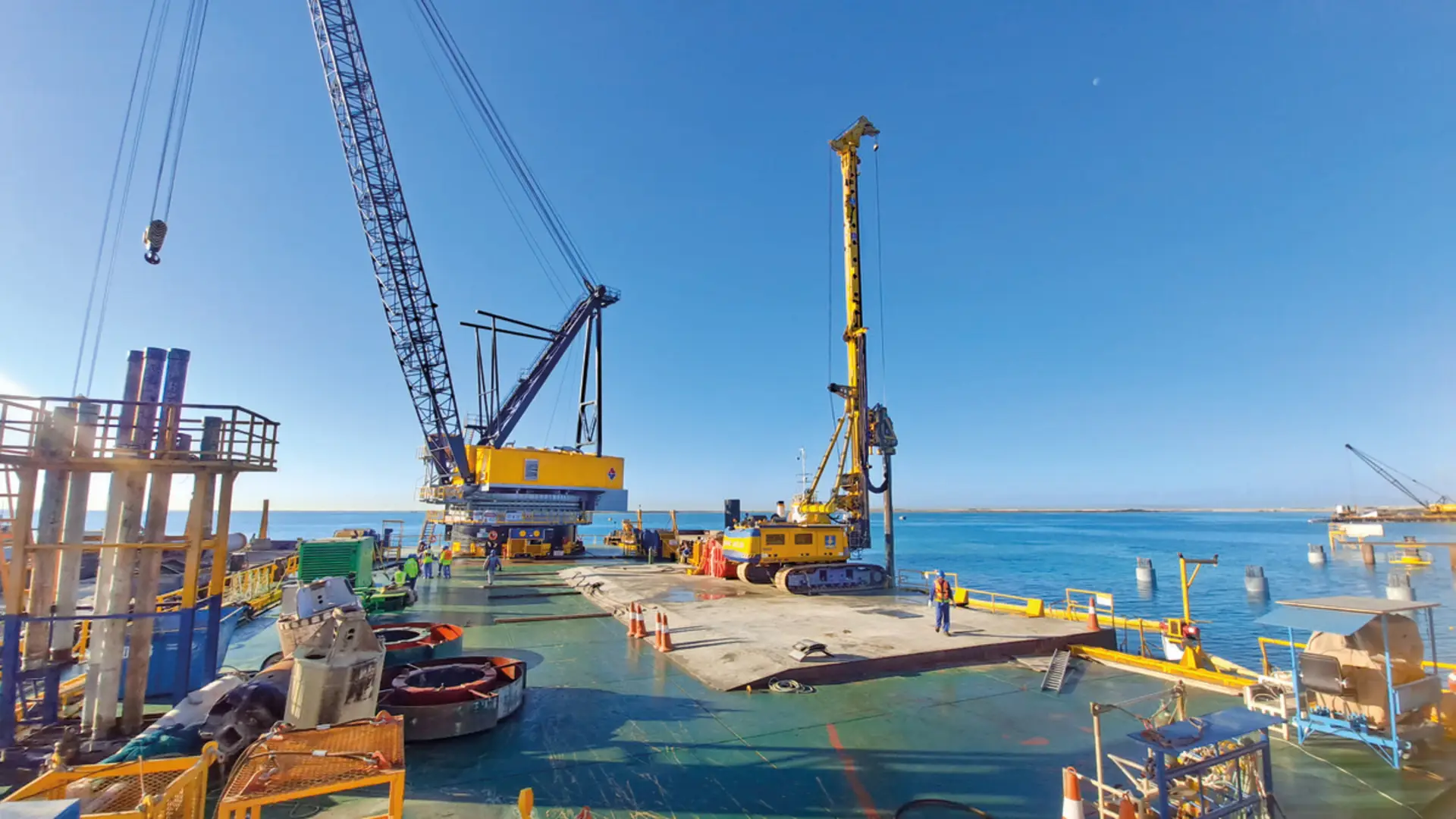 Approximately 500 km north of the city of Jeddah in Saudi Arabia, a new recreation area is currently being established as part of the “Red Sea Islands” Project that will combine nature, culture and adventure. By 2030, a total of 28,000 m² of beach, desert, mountains and volcanic areas on 22 islands will be transformed into an environmentally-friendly tourism center in Saudi Arabia. The sensational achievement: As part of this megaproject in Saudi Arabia, Bauer installed piles for several bridge structures with diameters of up to 1,500 mm. The specially manufactured floating crane from the client Archirodon and their team assisted the Bauer piling team with the construction of 87 offshore piles. This was no everyday place to work, even for the experts from Bauer.