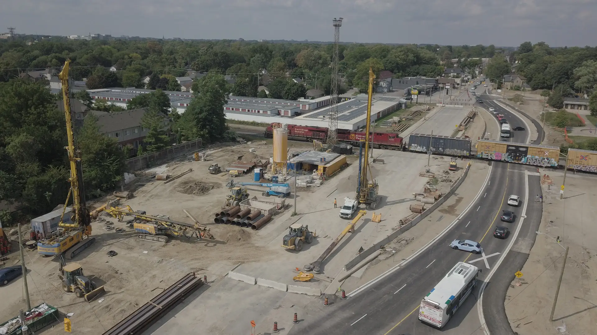 Our experts at Bauer Foundations Canada were contracted to construct a cutoff wall, a permanent retaining wall, temporary protection systems, and a pumping station shaft for the construction of a grade separation in London, Ontario, Canada. The grade separation was required to realign a four lane road, with multi-use pathways, below a busy rail corridor. Multiple techniques: We installed 315 linear metres of cut off wall, a total of 489 secant piles, 618 square metres of timber lagging, and 42 temporary anchors. Significant planning was required to coordinate complex operations at this busy construction site.