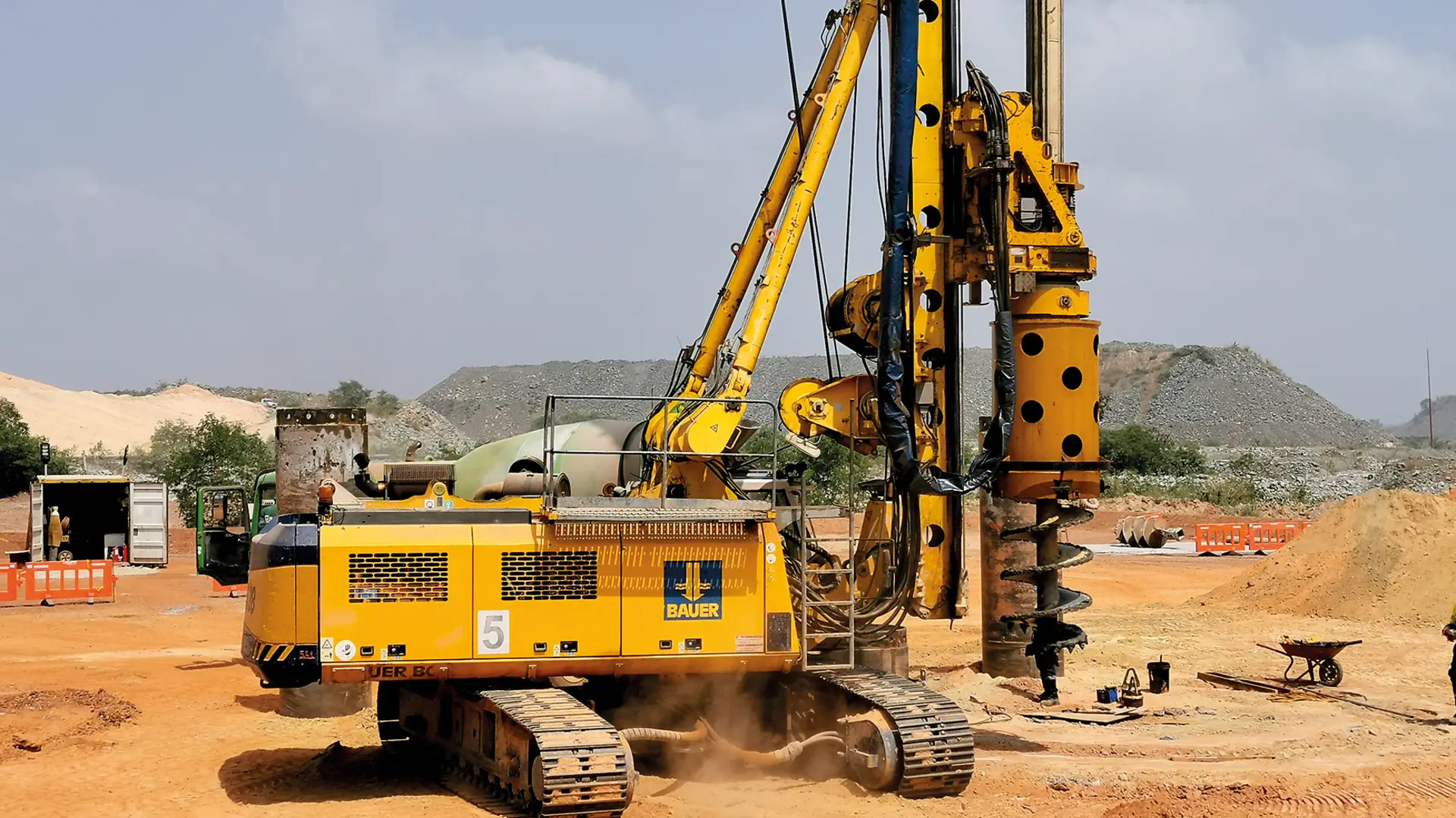 In the Sefwi volcano belt in Ghana, our experts from Bauer Spezialtiefbau constructed guide walls and three shafts for the Ahafo Mine. Two shafts are for ventilation, the third for conveying excavated material. For the RAR shaft (diameter 5.1 m), 29 secant piles, four support piles and one center pile were installed up to a depth of 31 m. The material removal shaft was outfitted with piles made of fiber-reinforced concrete for maximum abrasion resistance. In terms of geology, the work encountered hard gabbro with a compressive strength of up to 293 MPa. Thanks to state-of-the-art technology, Bauer mastered these challenging conditions and established a stable basis for the mine expansion.